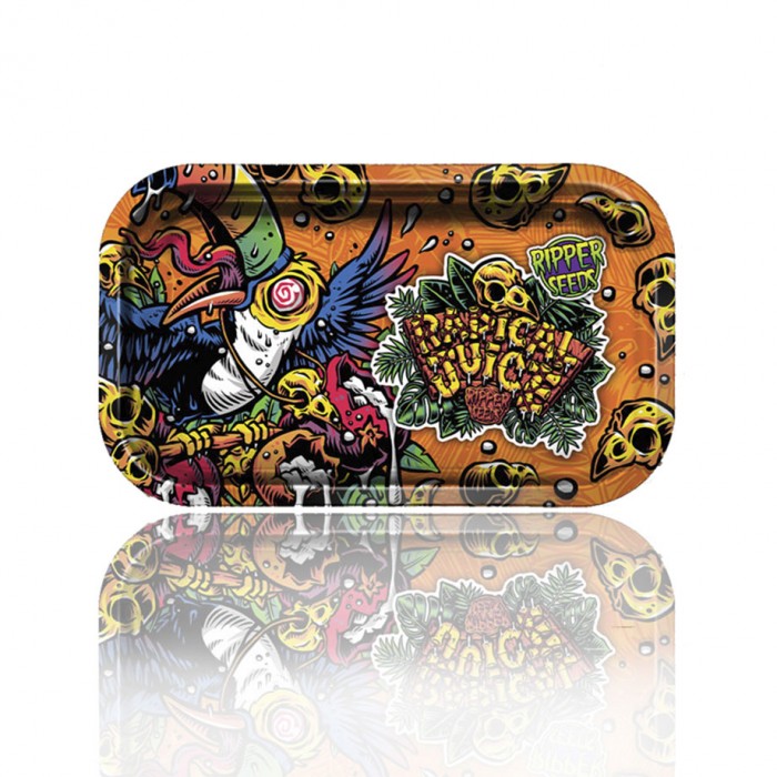 Bandeja de metal para liar, ilustradas con la imagen corporativa de Radical Juice y con la parte de abajo dorada.
